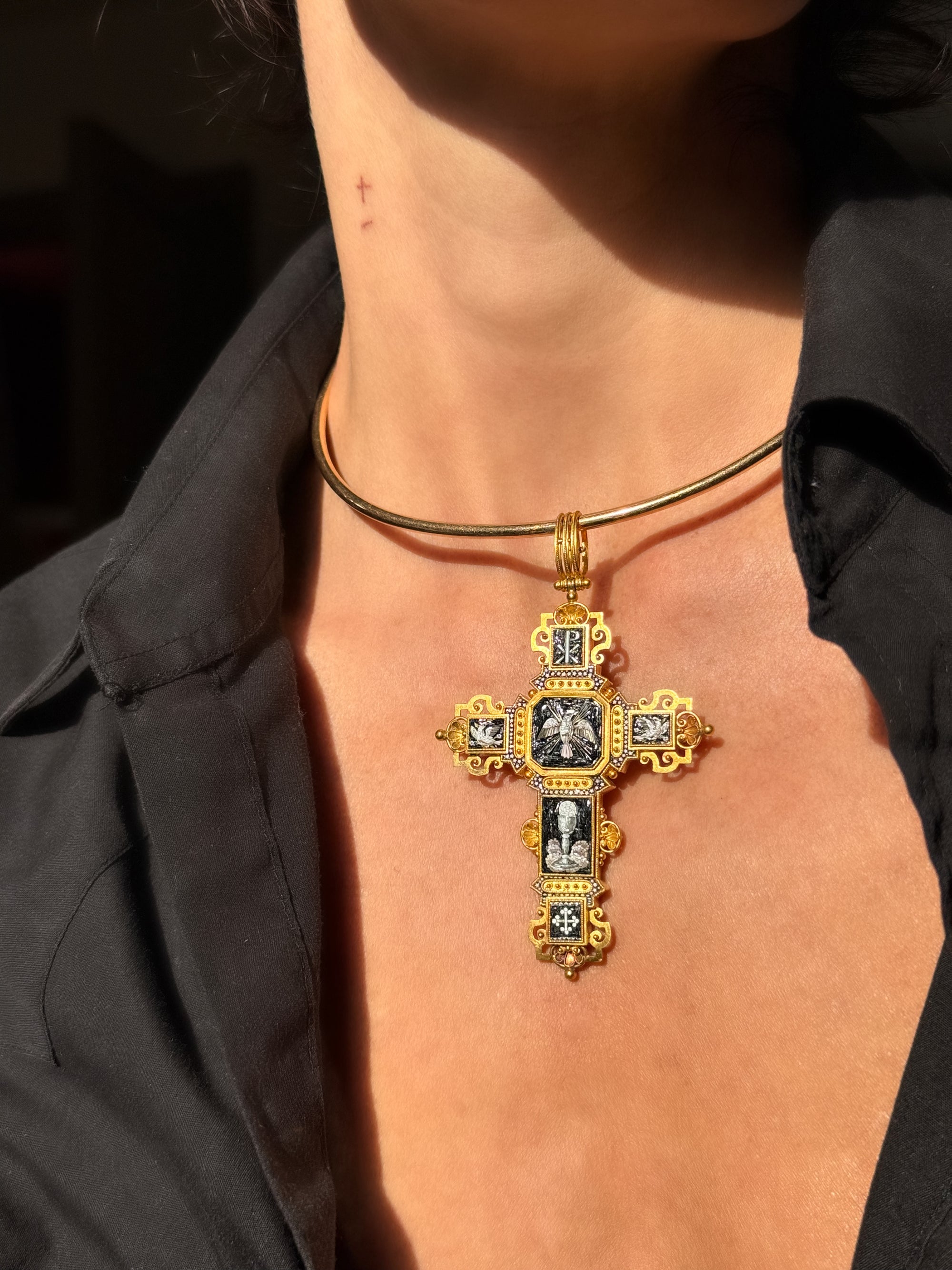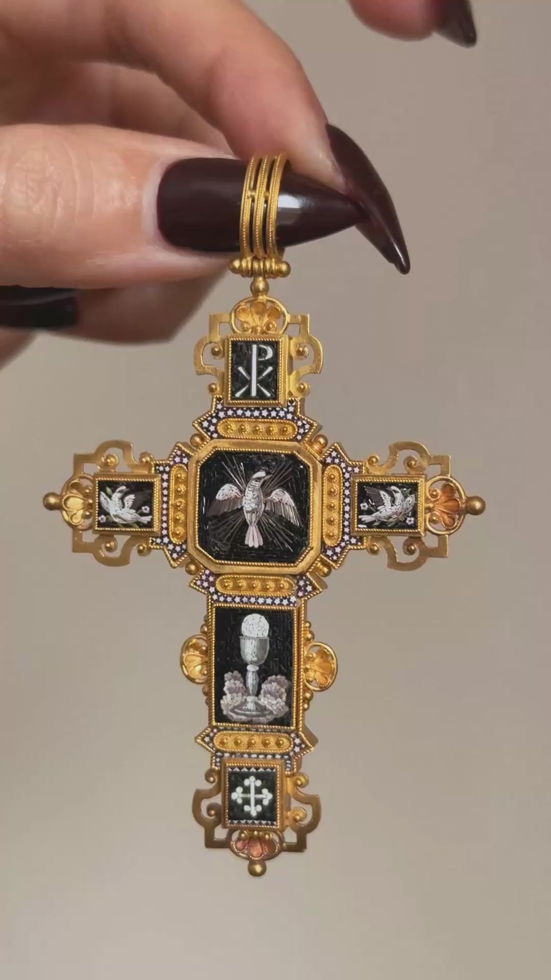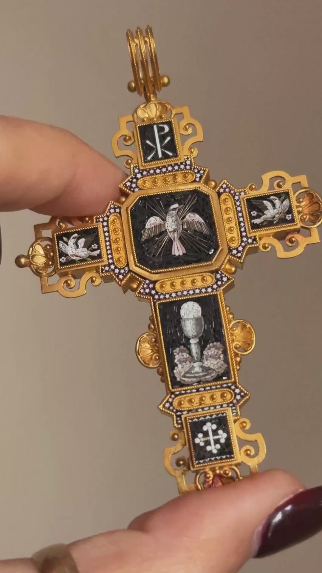 THREE DOVES, THE EUCHARIST AND A BOTONNÉ WALK INTO A 24K GOLD BAR // 19TH CENTURY MICRO MOSAIC RELIQUARY ORTHODOX CROSS