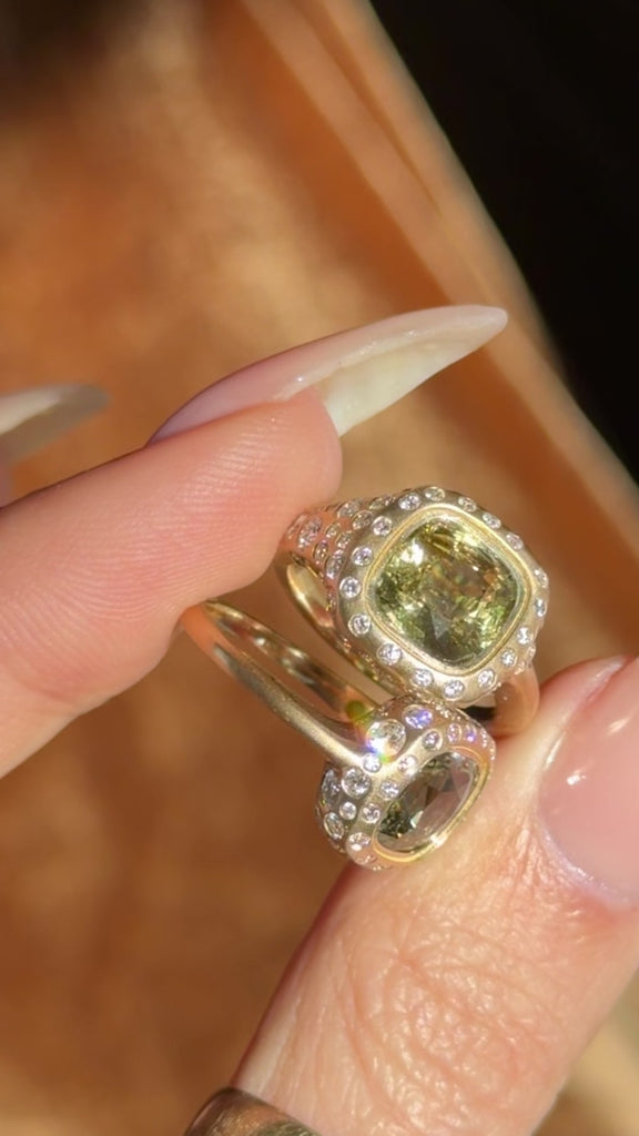 Material - 18k Brushed Yellow Gold, Two (2) Cushion Brilliant Yellow-Green Sapphires (2.54ct GIA #5231614743 / 2.59ct GIA #2235614741)