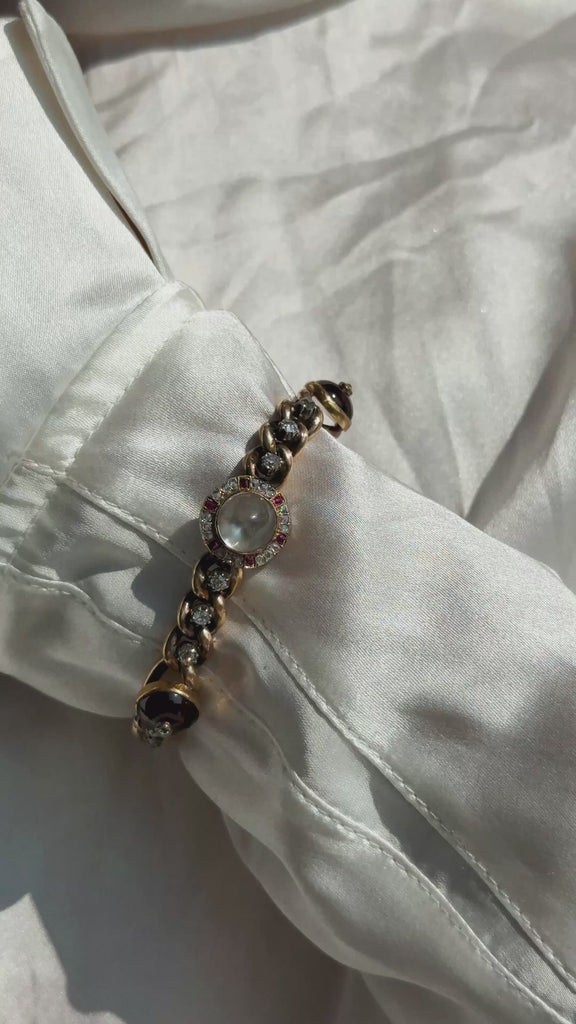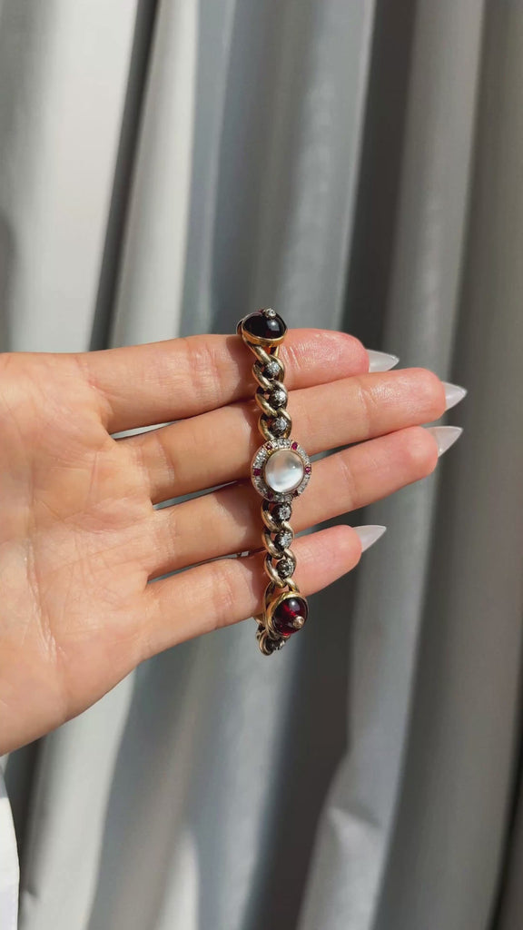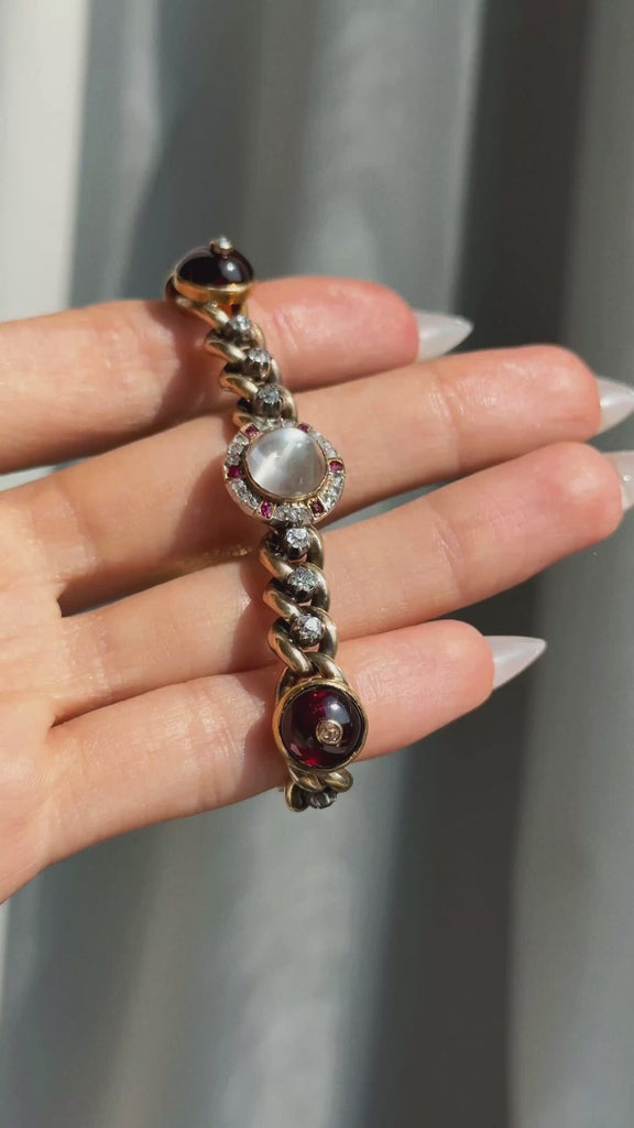 Materials - 14k Yellow Gold, Sterling Silver, Old Mine Cut Diamonds (1.45tcw), Rectangular Rubies (0.25tcw), One (1) Round Moonstone & Two (2) Round Garnets