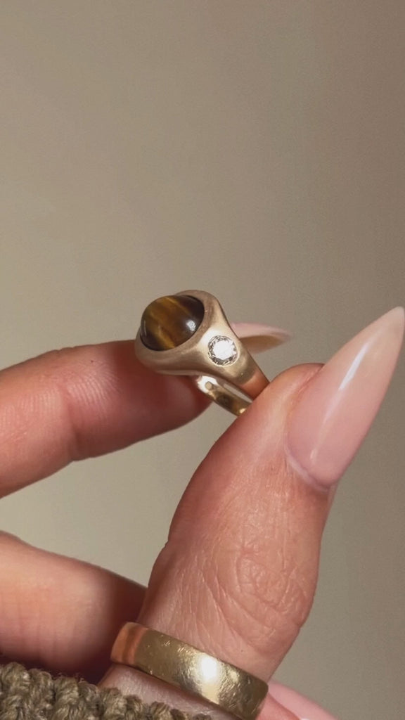 Material - 18k Brushed Yellow Gold, One (1) Tigers Eye Cabochon & Two (2) Accent Diamonds (0.42tcw)