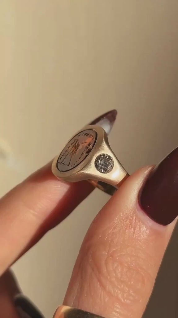 Materials - 14k Brushed Yellow Gold, One (1) Glass Intaglio "No Reward Without Labour" & Two (2) Diamonds (0.94tcw)