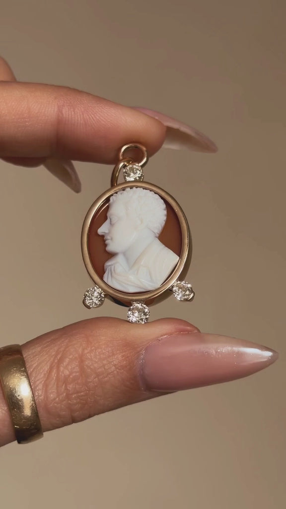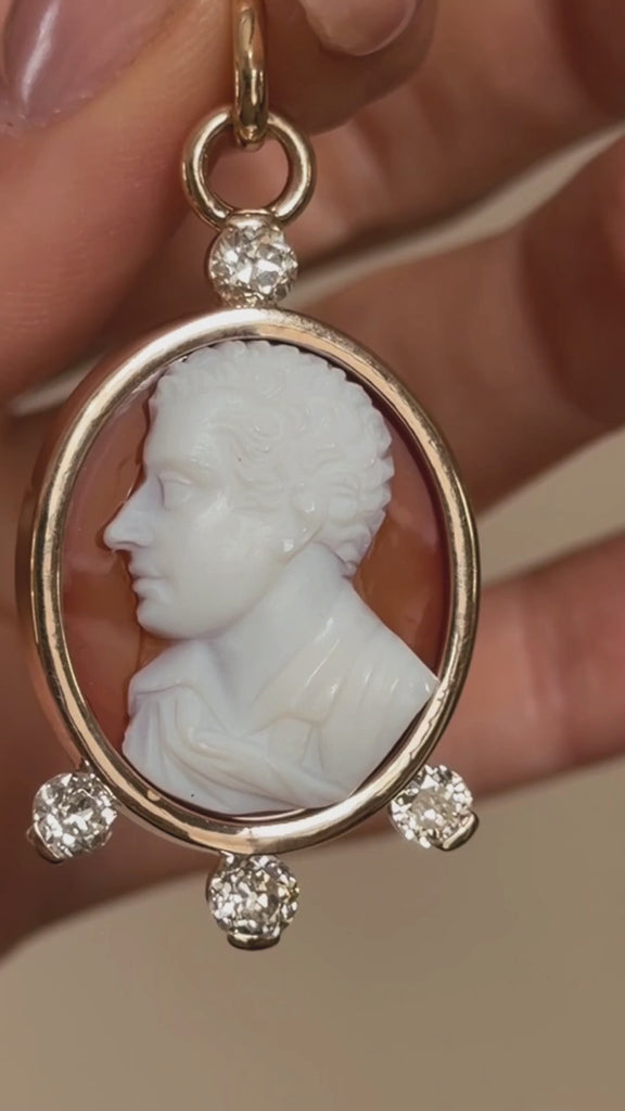 Material - 14k Yellow Gold, One (1) Carved Agate Cameo & Four (4) Diamonds (approx. 1.12tcw)