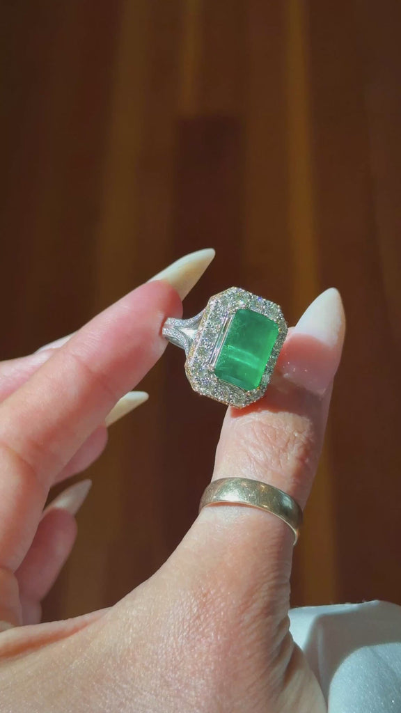 Materials - 14k White + Yellow Gold, One (1) Emerald Cut Emerald (5.21ct GIA #5231555621) + Ninety-Two (92) Accent Diamonds (2.07ct H-I VS)