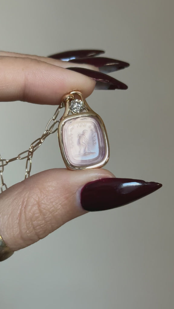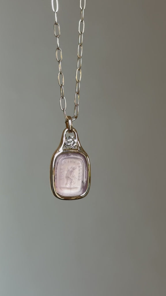 Materials - 18k Yellow Gold, Amethyst Intaglio "It Takes Time" & One (1) Diamond (0.52ct) on a 14k 20" Paperclip Chain