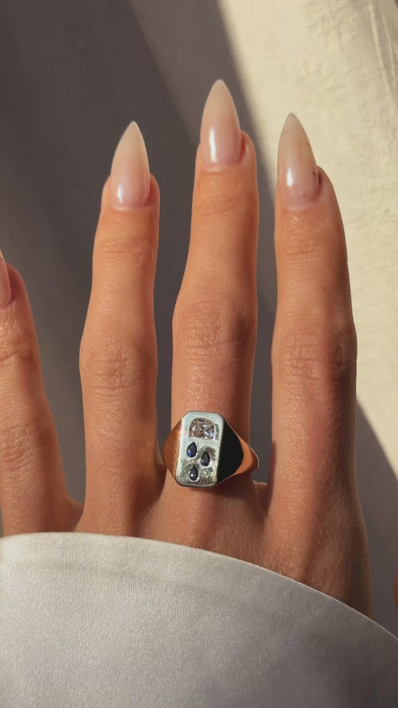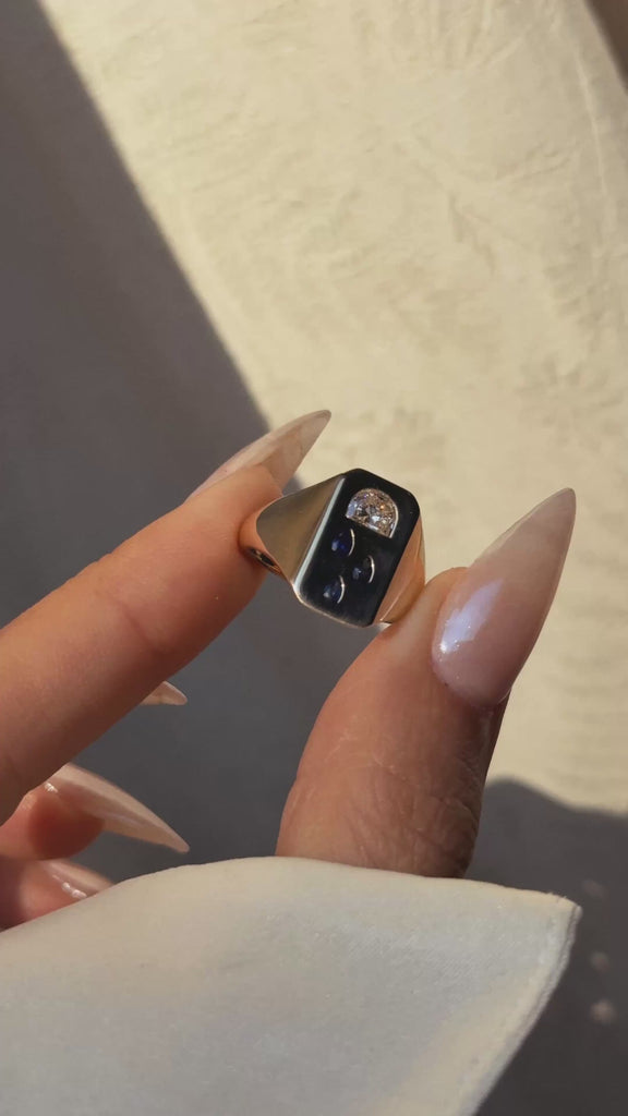 Materials - 14k Yellow Gold, One (1) Half moon Diamond (0.36ct) & Three (3) Sapphires (0.24tcw)
