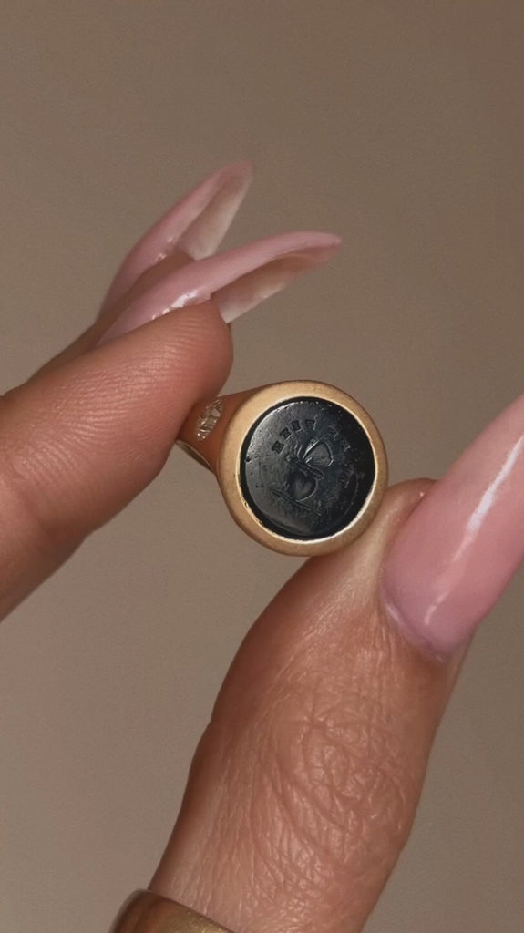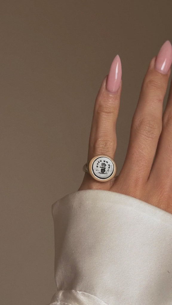Material - 18k Brushed Yellow Gold, One (1) Glass Intaglio ("Tu Me Fixe" / "You Fix Your Gaze On Me")& Two (2) Diamonds (0.56tcw)